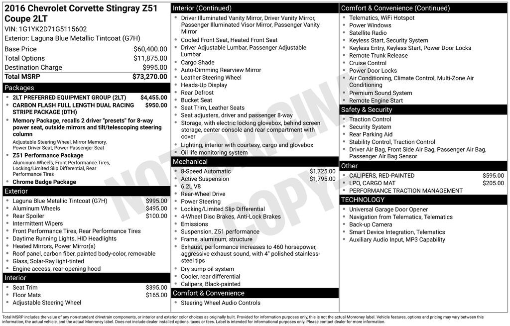 Recent Arrival! Priced below KBB Fair Purchase Price! 2016 Chevrolet Corvette Stingray Z51 in Laguna Blue Metallic Tintcoat vehicle highlights include, **ALLOY WHEELS**, **LEATHER**, **KEYLESS ENTRY**, **MULTI-ZONE CLIMATE CONTROL**, **BACK UP CAMERA**, **POWER SEATS**, *PREMIUM SOUND SYSTEM**, **KEYLESS START**, **MUCH MORE**. Laguna Blue Metallic Tintcoat 2016 Chevrolet Corvette Stingray Z51 2LT