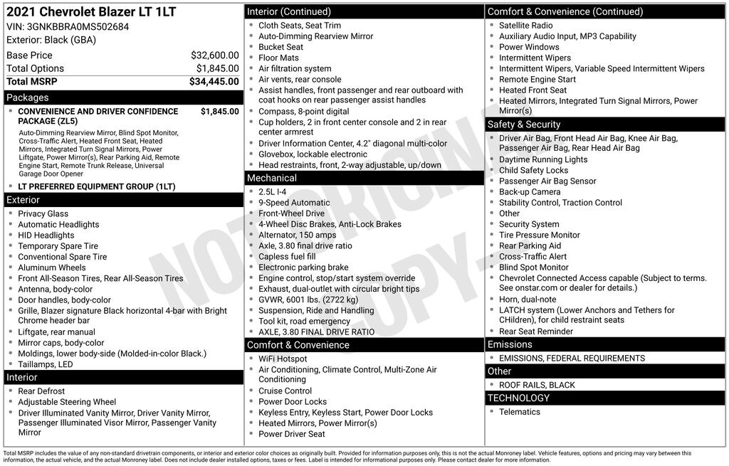 This is one impressive car. I purchased the Chevrolet Blazer with 6 cylinder engine. It has everything I want. Great acceleration, Great styling, Quiet engine, Well equiped, I really like the turn signals in the mirrors, push button start, blind spot monitoring, cross traffic monitoring, Continental Tires, and easy pairing of cell phone. I did not get AWD or GPS. There is nothing, I would change and for the price, a great deal to boot. You won't be disappointed.… - 5.0