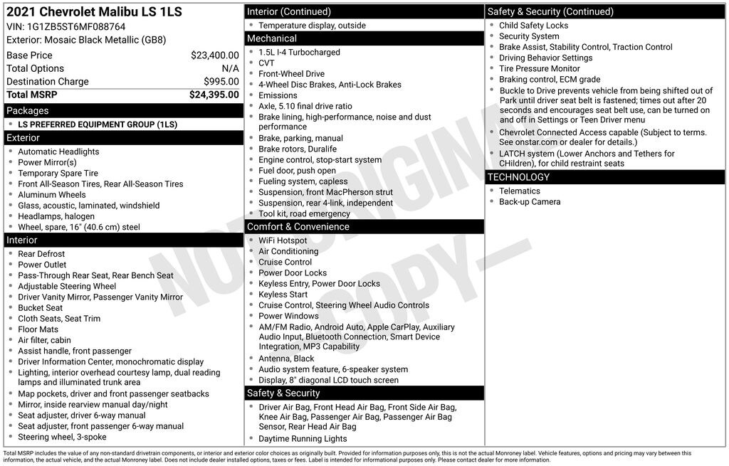 Recent Arrival! CARFAX One-Owner. Clean CARFAX. Odometer is 11390 miles below market average! 2021 Chevrolet Malibu LS in Mosaic Black Metallic vehicle highlights include, **CLEAN CARFAX**, **ONE OWNER**, **ALLOY WHEELS**, **BACK UP CAMERA**, **POWER SEATS**, ** MULTI FUNCTION STEERING WHEELS**, *PREMIUM SOUND SYSTEM**, **REAR PARKING AID**, **MUCH MORE**, Jet Black Cloth. Mosaic Black Metallic 2021 Chevrolet Malibu LS 1LS