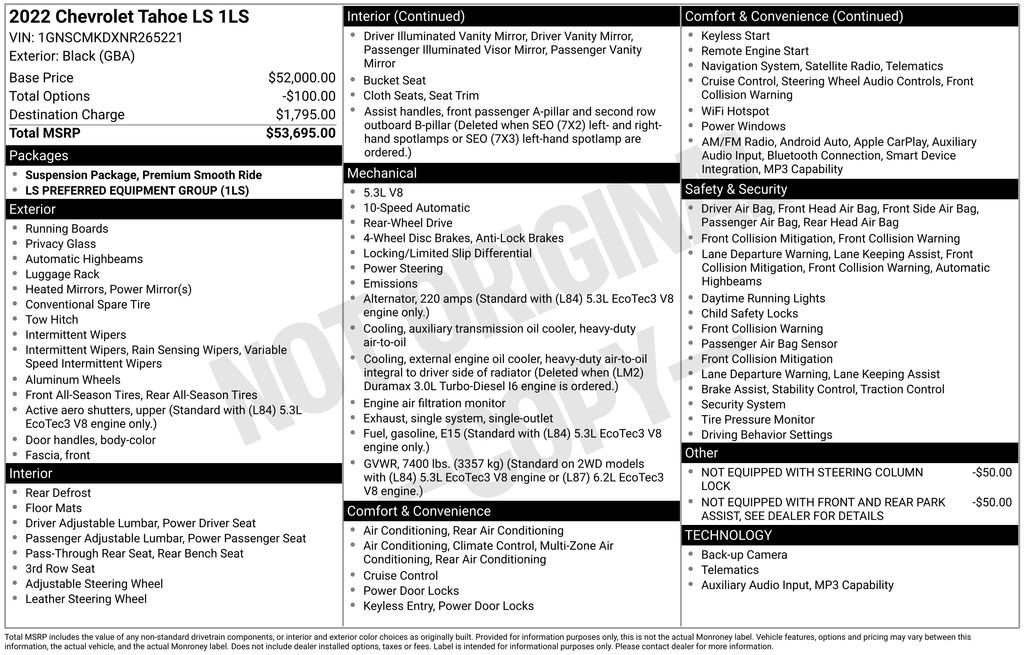 Recent Arrival! CARFAX One-Owner. Clean CARFAX. Priced below KBB Fair Purchase Price! 2022 Chevrolet Tahoe LS in Black vehicle highlights include, **CLEAN CARFAX**, **ONE OWNER**, **ALLOY WHEELS**, **LEATHER**, **KEYLESS ENTRY**, **MULTI-ZONE CLIMATE CONTROL**, **BACK UP CAMERA**, ** MULTI FUNCTION STEERING WHEELS**, *PREMIUM SOUND SYSTEM**, **MUCH MORE**, Jet Black Cloth. Black 2022 Chevrolet Tahoe LS