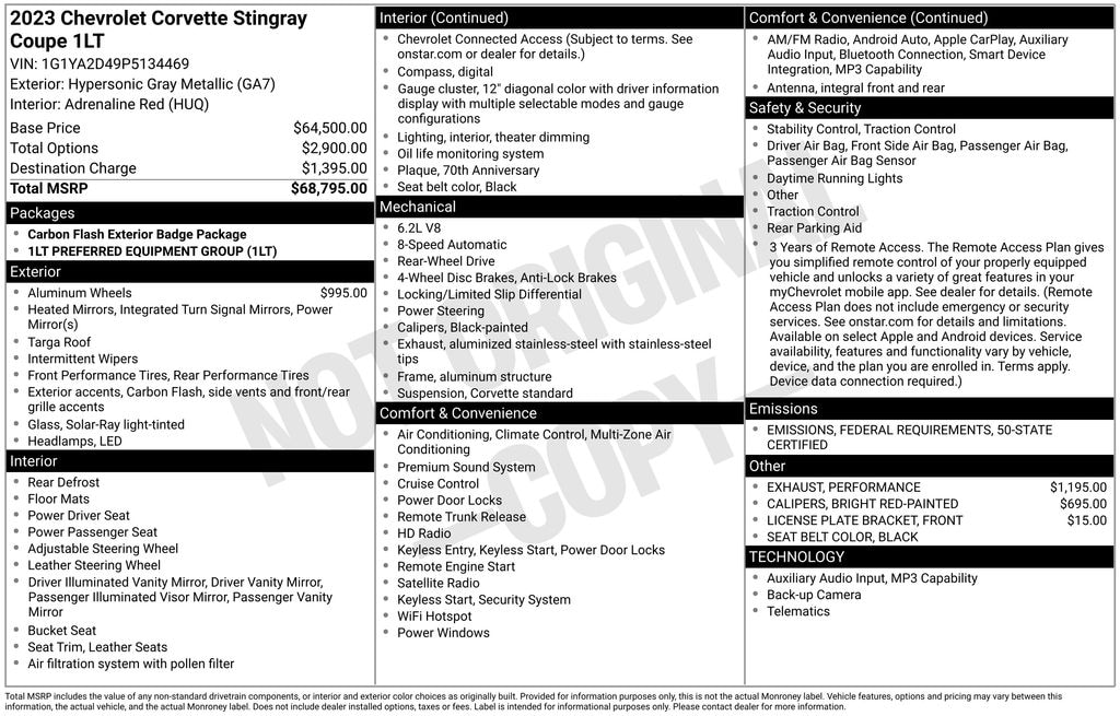 Recent Arrival! Clean CARFAX. Priced below KBB Fair Purchase Price! Odometer is 1464 miles below market average! 2023 Chevrolet Corvette Stingray in Hypersonic Gray Metallic vehicle highlights include, **CLEAN CARFAX**, **ALLOY WHEELS**, **LEATHER**, **KEYLESS ENTRY**, ** MULTI FUNCTION STEERING WHEELS**, *PREMIUM SOUND SYSTEM**, **REAR PARKING AID**, **KEYLESS START**, **MANY MORE OPTIONS**. Hypersonic Gray Metallic 2023 Chevrolet Corvette Stingray 1LT