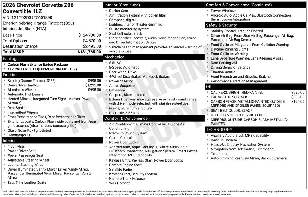 CARFAX One-Owner. Clean CARFAX. **CLEAN CARFAX**, **ONE OWNER**, **STILL UNDER FACTORY WARRANTY**, **ALLOY WHEELS**, **LEATHER**, **KEYLESS ENTRY**, **MULTI-ZONE CLIMATE CONTROL**, **BACK UP CAMERA**, **POWER SEATS**, ** MULTI FUNCTION STEERING WHEELS**, **SATTALITE RADIO**, **REMOTE START**, **COOLED &HEATED SEATS**, *PREMIUM SOUND SYSTEM**, **REAR PARKING AID**, **KEYLESS START**, **MANY MORE OPTIONS**. Sebring Orange Tintcoat 2026 Chevrolet Corvette Z06 1LZ
