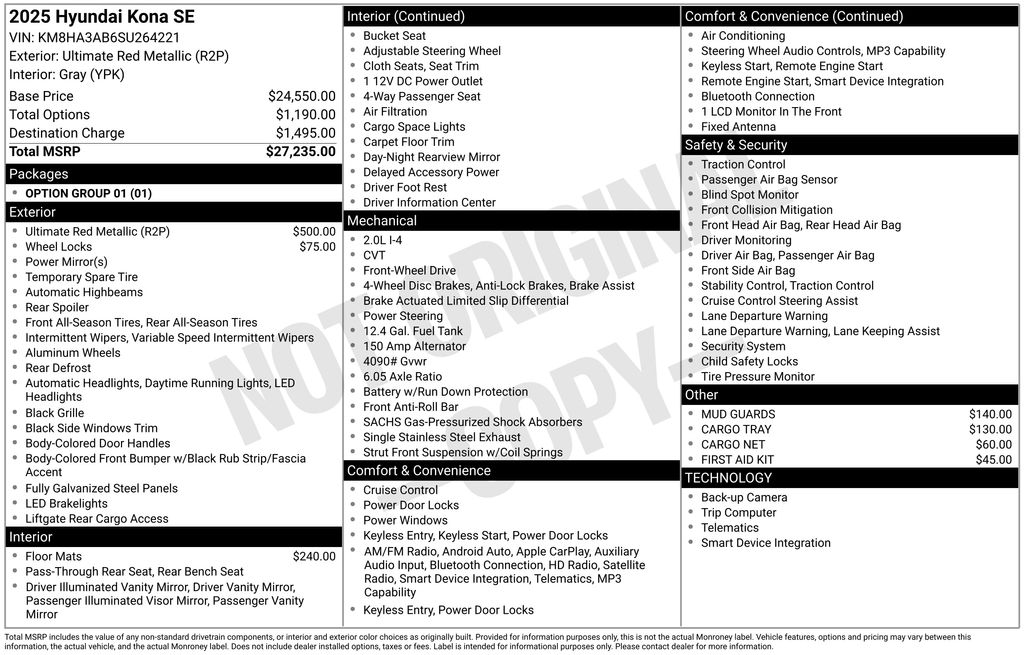 Recent Arrival! CARFAX One-Owner. Clean CARFAX. Priced below KBB Fair Purchase Price! 2025 Hyundai Kona SE in Red Metallic vehicle highlights include, **CLEAN CARFAX**, **ONE OWNER**, **STILL UNDER FACTORY WARRANTY**, **ALLOY WHEELS**, **KEYLESS ENTRY**, **MULTI-ZONE CLIMATE CONTROL**, **BACK UP CAMERA**, ** MULTI FUNCTION STEERING WHEELS**, *PREMIUM SOUND SYSTEM**, **MANY MORE OPTIONS**. Red Metallic 2025 Hyundai Kona SE