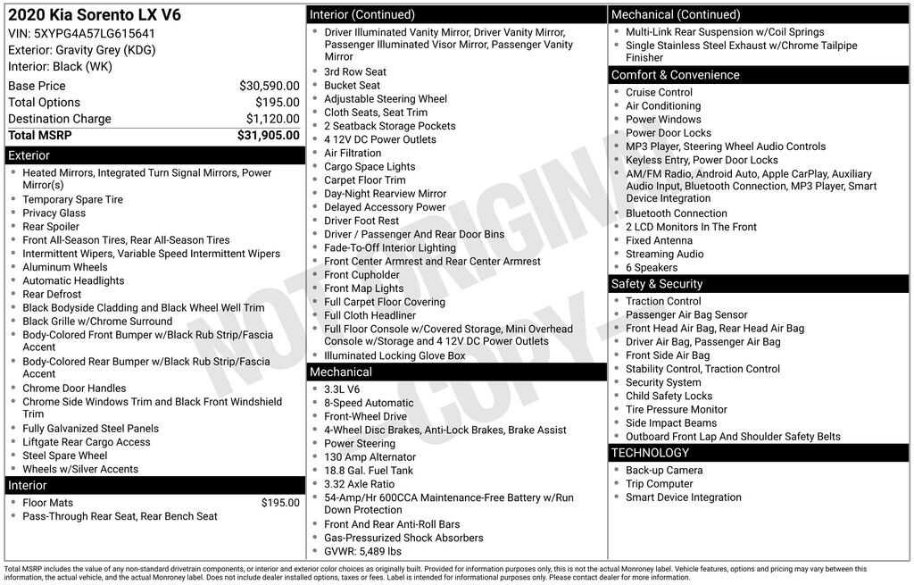 Recent Arrival! Priced below KBB Fair Purchase Price! **CLEAN CARFAX**, **ALLOY WHEELS**, **KEYLESS ENTRY**, **BACK UP CAMERA**, ** MULTI FUNCTION STEERING WHEELS**, *PREMIUM SOUND SYSTEM**, **MUCH MORE**. Gravity Gray 2020 Kia Sorento LX