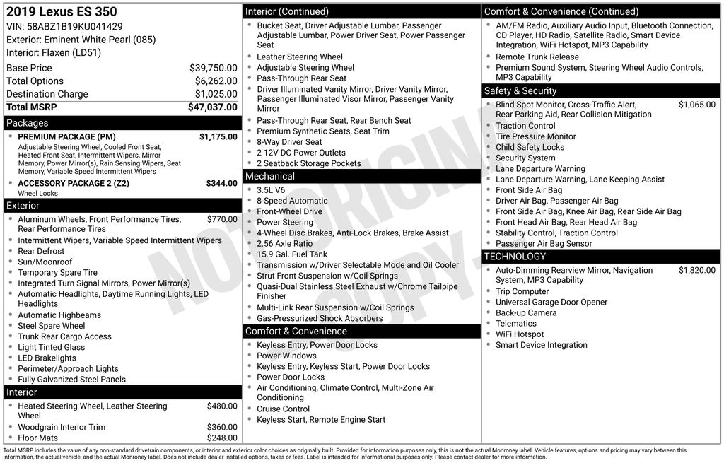 Recent Arrival! Priced below KBB Fair Purchase Price! Flaxen Premium Synthetic. White Pearl 2019 Lexus ES 350